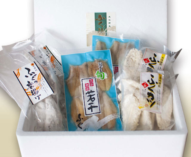 ふぐの本場山口県下関市。ここでは「福」にちなんで河豚を「ふく」と呼びます。暖流と寒流が交わる絶好の漁場、日本海から東シナ海にかけて獲れた天然のシロサバフグを、ひとつひとつ丁寧に加工しました。天然ふく家族は、ふく一夜干、ふく唐揚げ、ふくカツの3種類の味が楽しめるセットです。それぞれ独自の製法で味付けし、無添加にこだわりました。家族全員に喜ばれる絶品のふく家族を是非お召し上がりご堪能ください。御進物、お祝い品にも大変縁起の良い喜ばれる商品です。